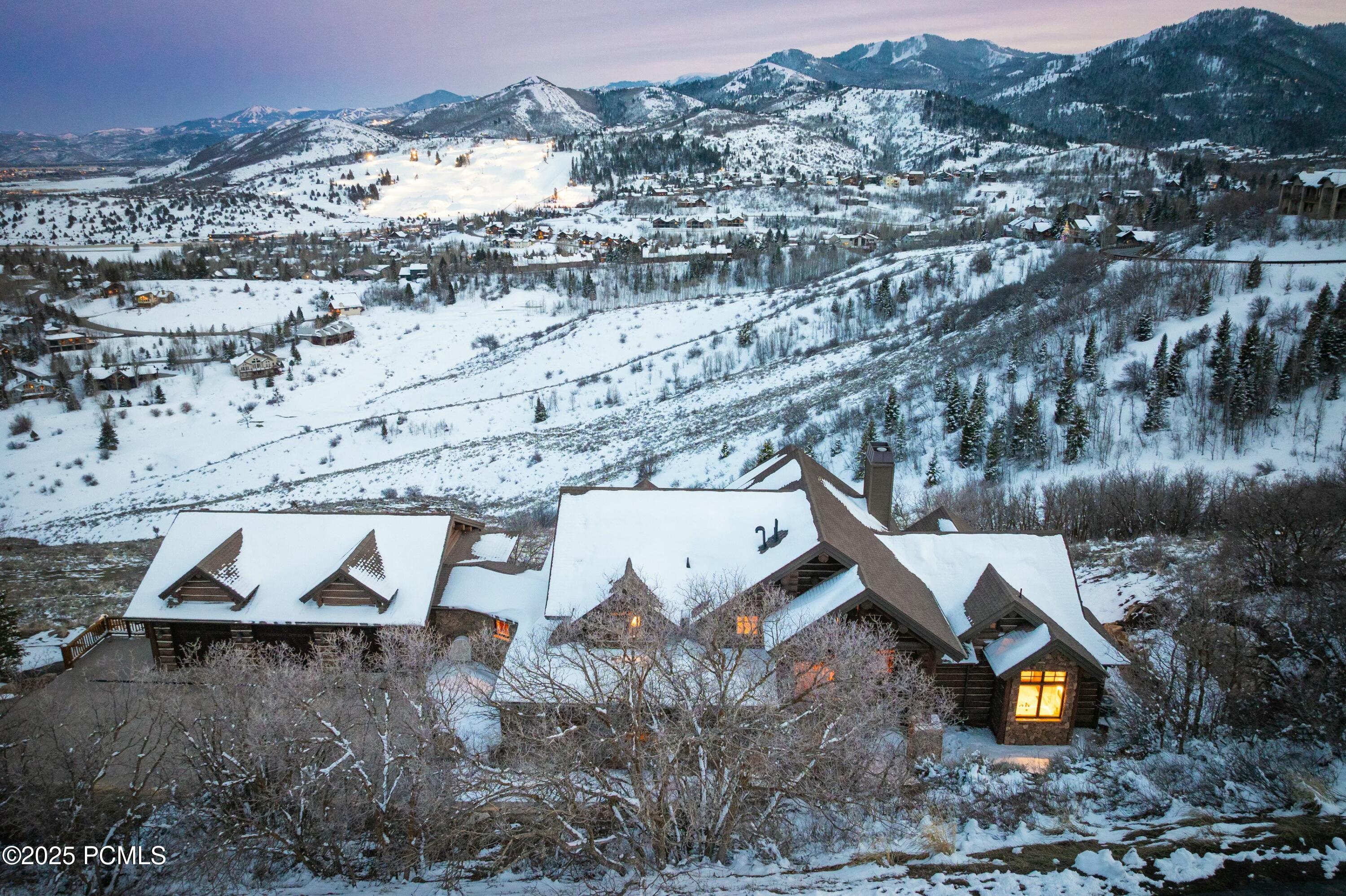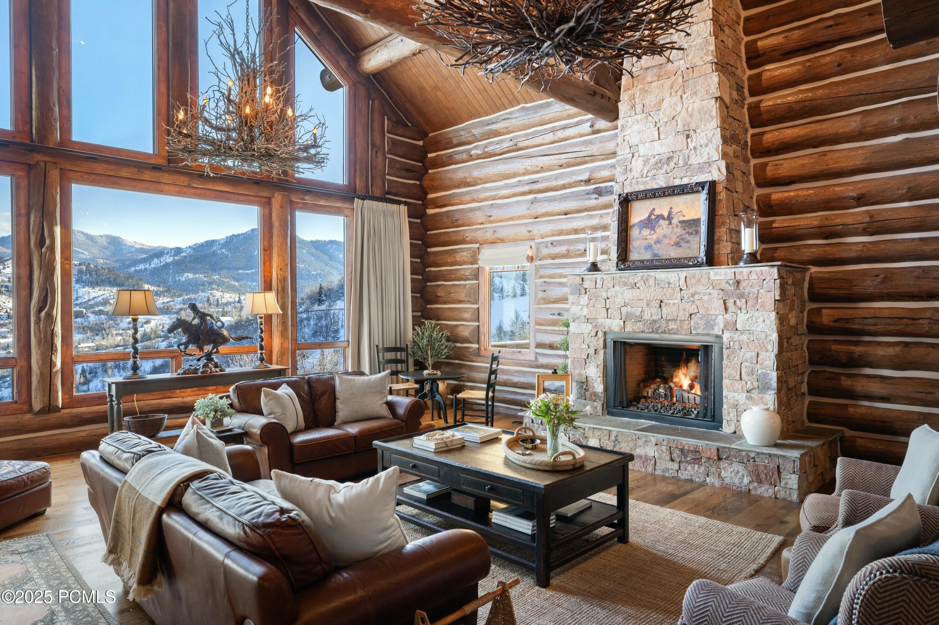 Nestled within the prestigious gated community of Moose Hollow, this remarkable estate blends masterful craftsmanship with breathtaking natural surroundings. Constructed by Idaho-Montana Log Homes, the property showcases stunning logs sourced from Yellowstone National Park, each adding character and warmth to the home's design. Positioned on a sun-drenched 2.93-acre lot and backing to 60 acres of open space, the residence captures sweeping, unobstructed views of world-class ski resorts, a pristine golf course, and the majestic Uinta Mountains. Thoughtfully designed with soaring ceilings and expansive windows, the home is bathed in natural light. Distinctive details include hand-scraped log beams, Venetian plaster, bespoke lighting, and a striking 700-pound hand-carved travertine kitchen sink. Car enthusiasts will appreciate the two garages accommodating up to nine vehicles. Lightly lived in as a second home, this property is in immaculate condition. Ideally located just 15 minutes from Park City's renowned ski slopes and under 30 minutes to Salt Lake City International Airport, this is a rare opportunity to own a true mountain sanctuary.